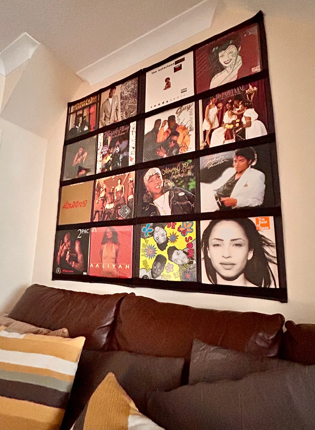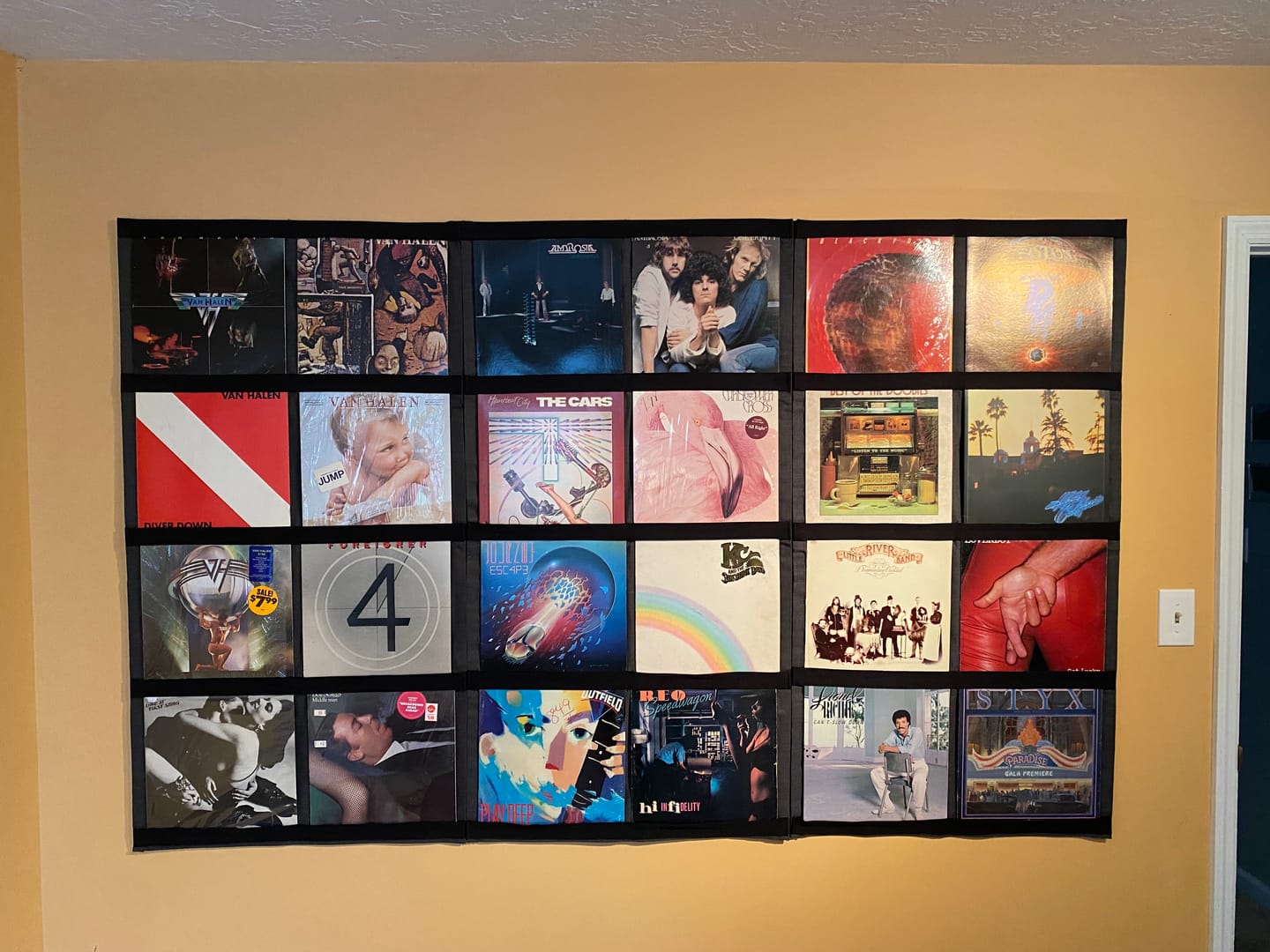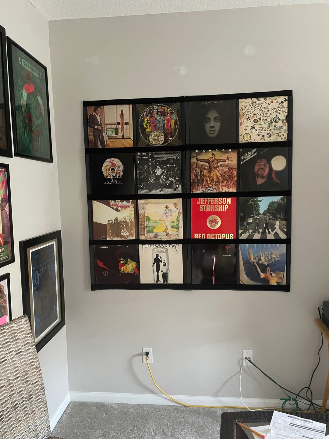 The frame is made from a two-tone, dark grey oxford weave fabric with cotton straps to hold the records in place.